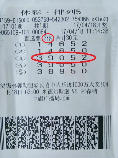 中国体育彩票排列五第17101期于2017年4月19日开奖,开奖结果:3 9 0 5 2,当期全国共开出18注10万元大奖,乌兰察布市的一位彩民就十分幸运地收获了其中3注。