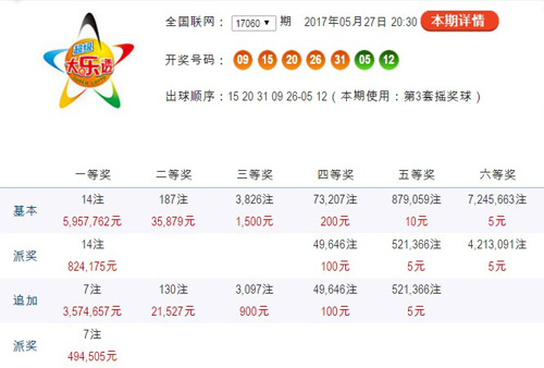 本期开奖过后,将有35.38亿元滚存至17061期。派奖方面,“5亿大派奖”活动将继续为头奖注入1000万元派奖奖金。总额3亿元的固定奖派奖奖金,已于当期派送完毕。体彩大乐透圆您大奖梦,彩民朋友赶快投注吧!