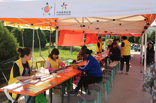 “来之于民,用之于民”是体育彩票的发行宗旨,其所筹集的部分公益金也用于全民健身事业,从社区的健身器械到体育场馆的建设都有体育彩票的身影,有力的推动了全民健身事业的发展。阿拉善盟体育彩票管理中心借助此次活动之机,在活动会场布置了40面道旗,色泽鲜艳的道旗介绍着体育彩票的公益理念、玩法特点;同时搭建了12个销售帐篷,供人们休息纳凉。现场销售活动让人们更加直观方便快捷的了解、参与其中。