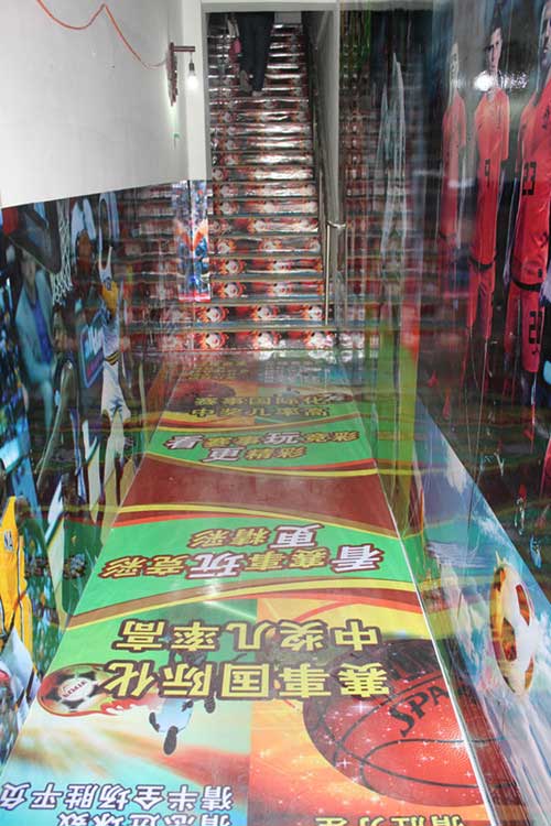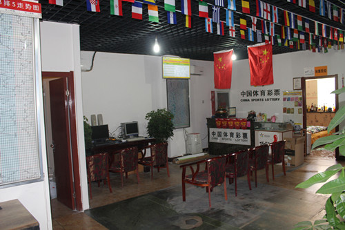 推开店门,让你出乎意料!一个象声词“哇哦”脱口而出。墙面上一整面的竞彩墙纸,让你的眼球被定格,转瞬,看到地面、台阶上都是竞彩元素的海报和logo,让你应接不暇。上到二楼,竞彩的吊旗,海报,国旗,让你觉得置身于球场。一台电脑滚动播放竞彩的图片,另一台电脑上播放竞彩赛事,电视上还有比赛,你是不是现在就想随着世界杯的音乐摇摆!