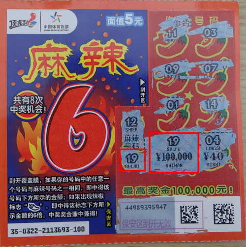 小格最先刮完没有中奖,他的未婚妻先把“麻辣号码”刮开,再逐一刮开“你的号码”,当发现号码“19”与“麻辣号码”对上时,她慢慢地刮开下面的中奖金额,只见上面赫然印着“100”,在一旁的小格连忙高兴地说:“手气不错啊,中了100元!”于是拿给销售员兑奖。