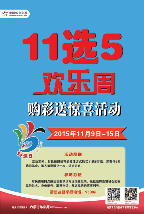体彩“11选5”又要任性啦!11月9日至11月15日,内蒙古体彩中心将启动“11选5欢乐周”活动,为彩民朋友持续七天发放购彩红包。